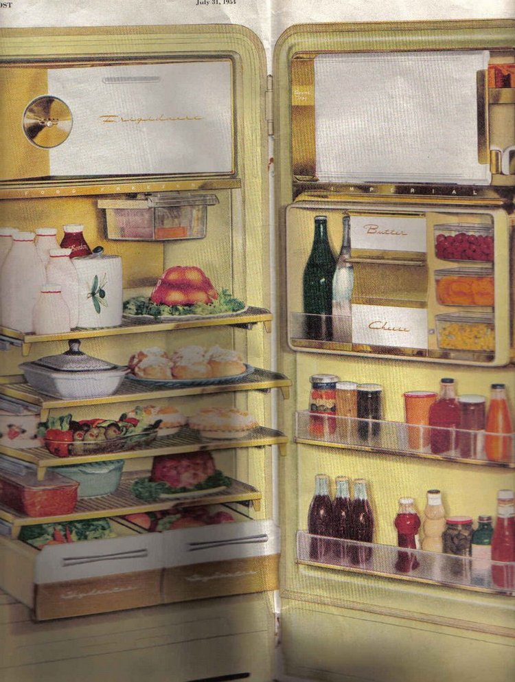 I bought this refrigerator at an estate sale auction for $5.00. At the same auction I bought a 1932 GE Monitortop for $25.00 (not working). The Imperial Cycla-Matic represents what I love about the 50's: Lots of bells and whistles. It has a warmed butter compartment and even has a convenient serving tray right in the door! The exterior is porcelin, not painted. It weighs more than the bigger 1951 GE I have. Below is a scan of an ad showing the interior. Mine is missing all of the door shelves and the vegetable drawers, but it has the serving tray. My interior is seafoam green.