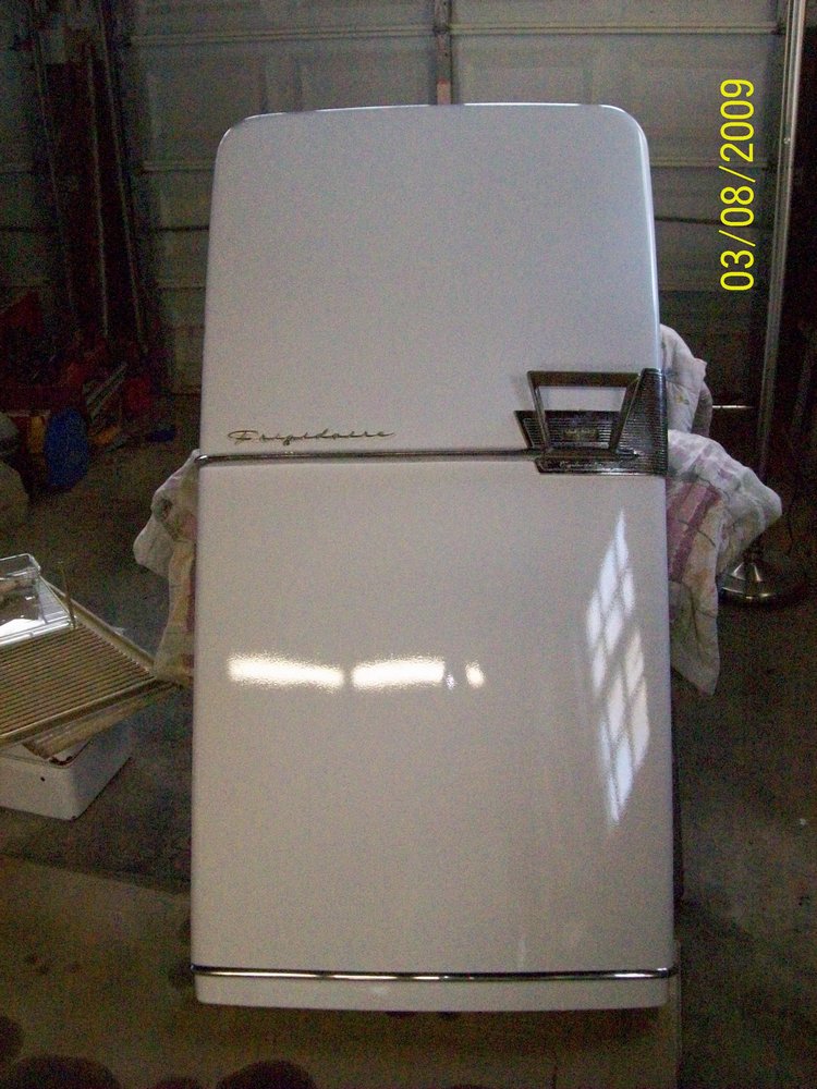 I started the restoration this week, mainly because a local school wants to use it in a school play. They wanted to paint over the rust, but that would be an even bigger mess to strip off when I restore the fridge, so I decided to restore it now. I have an employee whose son works at an automotive paint and body shop, he is doing the work for me this week. I disassembled the fridge for him. See the process in the following pictures. First I took the door off: