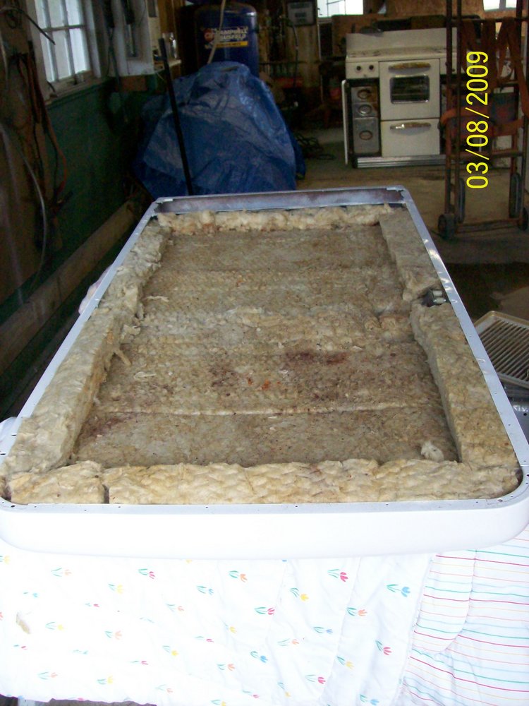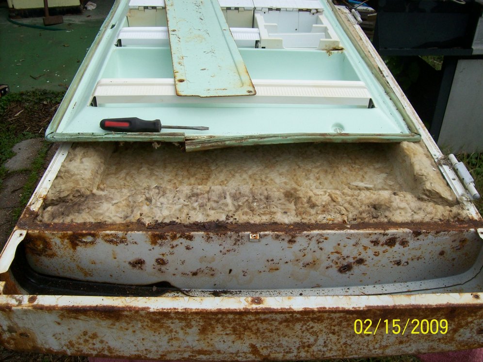 Next I took the door shelf insert out, which holds the door gasket in place, exposing the insulation. The door gasket will have to be replaced.