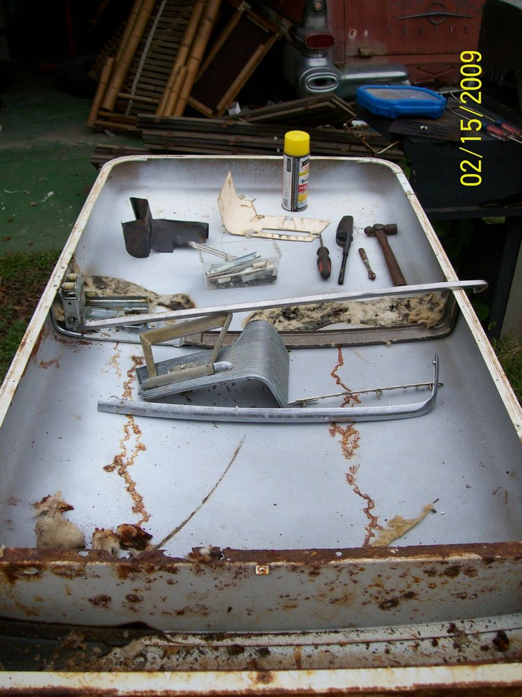 Insulation removed and exterior door chrome removed and sitting inside the door. Notice the rust on the crosspiece. The bodyman is going to weld in a new piece.