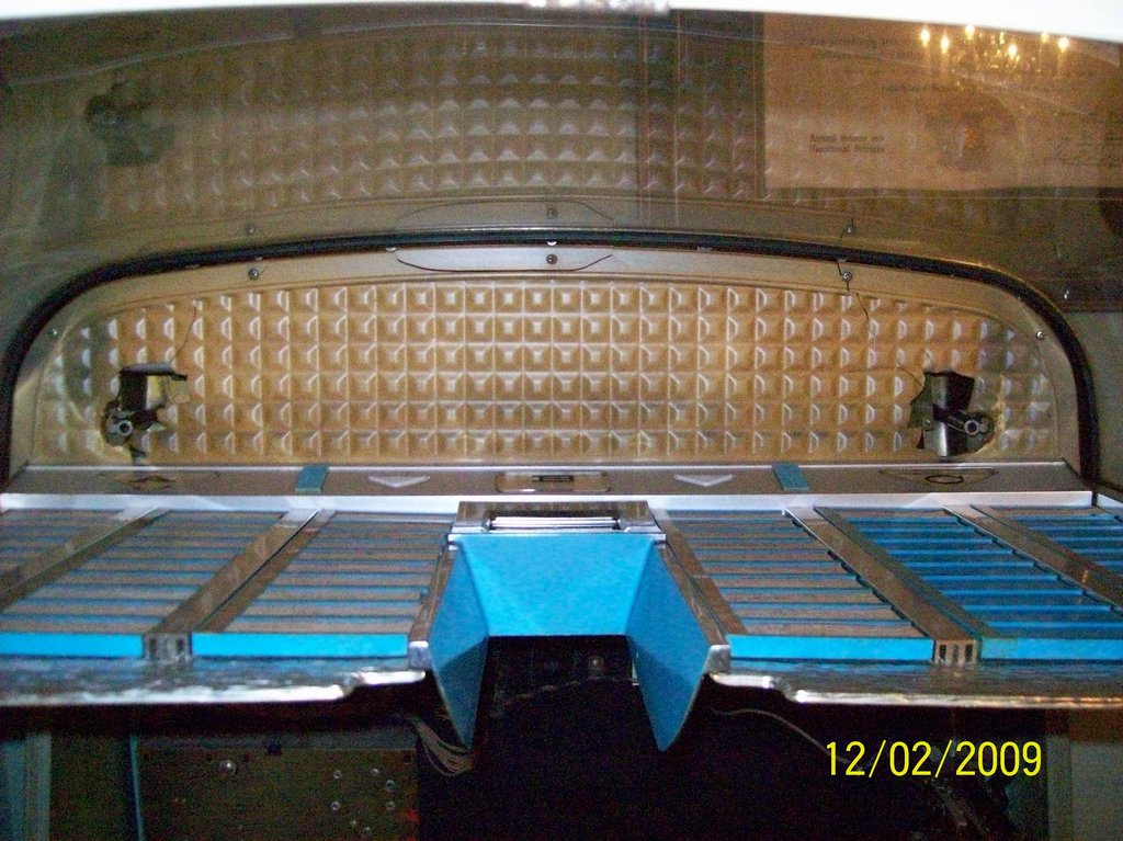 The Tempo II is the 25th anniversary model for Rock~ola and is the second year that stereo jukeboxes were made. My model 1478 can hold 60 records, for a total of 120 songs. The model 1485, which looks identical except for having five selector buttons at the top instead of three, could hold 100 records. About 5415 model 1478 jukeboxes were made. Mine is pretty good cosmetically, the major blemish being a cigarrette burn across selection buttons 38, 39, and 40. The mechanics work, but need adjusting and cleaning. The electronics need a lot of refurbishing. The paper capacitors need to be replaced, the tone arm needs to be rebuilt, and some of the wiring needs to be redone. The jukebox does not currently play due to these problems.