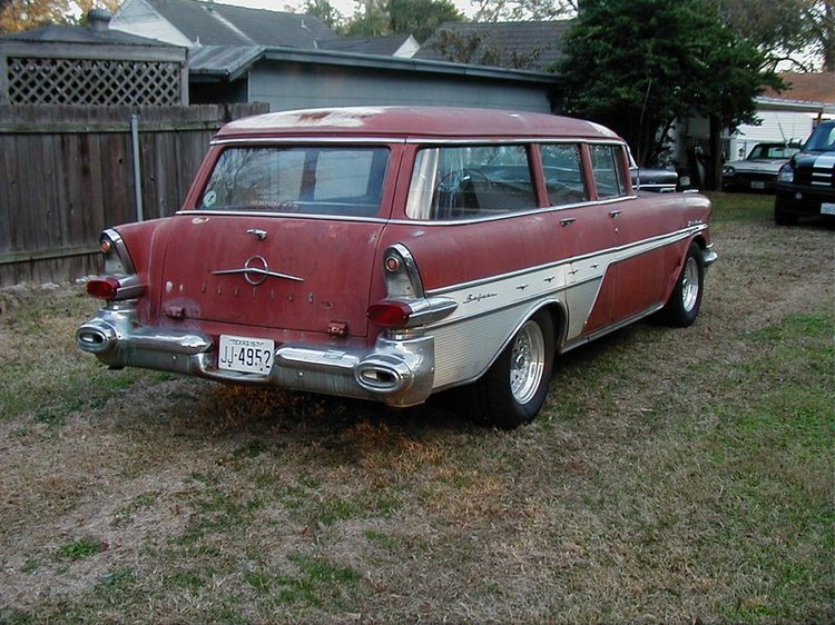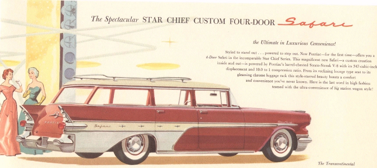 The Safari Transcontinental station wagon was the top of the line wagon for Pontiac in 1957. Approximately 1894 were made. It was introduced midway through the model year along with the Bonneville fuel injected convertible. This wagon came standard with leather upholstery, reclining passenger seat, 10:1 compression ratio 270hp 347ci V8 engine, and a chrome luggage rack. The Transcontinental also has special trim (rear quarters) which differentiates it from the regular Pontiac wagons. This trim is similar to the trim on the rear quarters of the Bonneville.