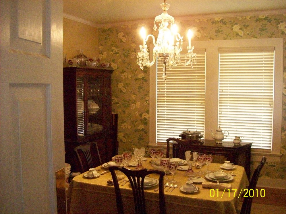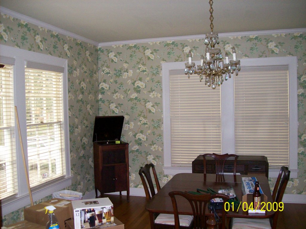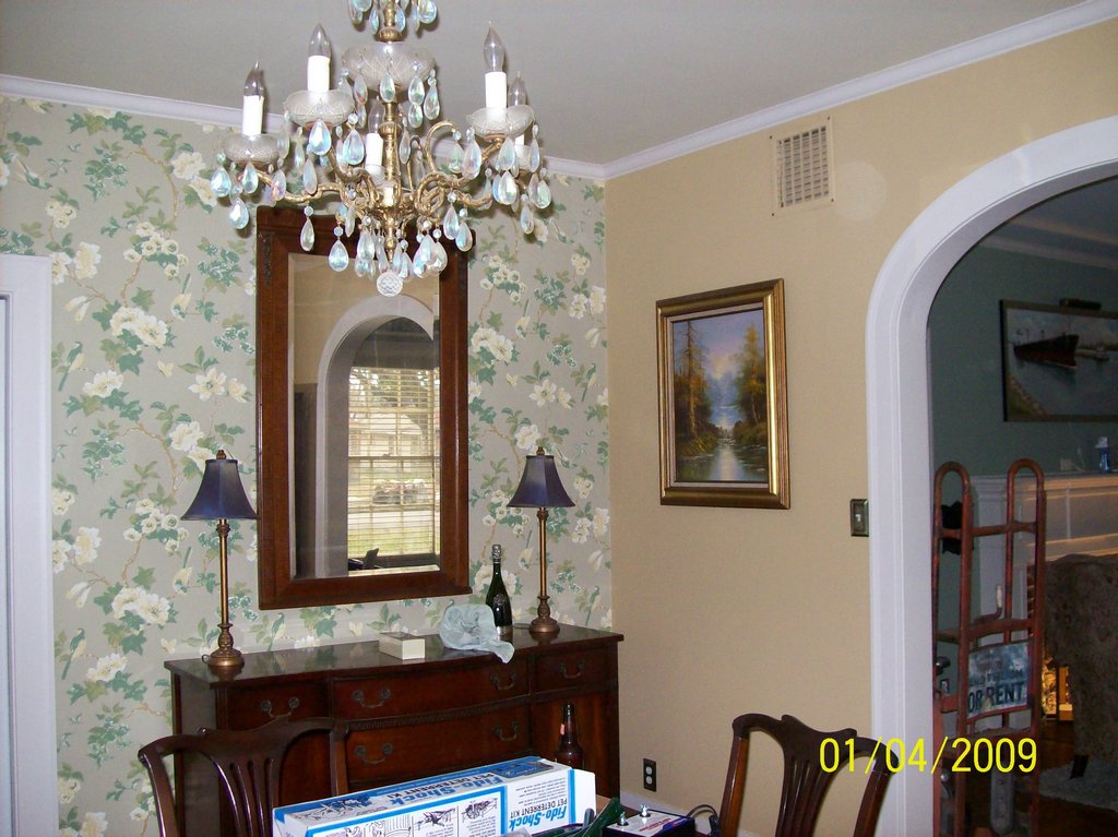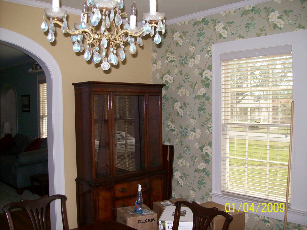 The dining room did not need much work. The wallpaper, on three of the four walls, came with the house when I bought it and goes well with the Duncan Phyfe dining room set. After Hurricane Ike, the wood floors had to be redone, so I painted the trim and baseboards. I used two colors from the wallpaper and painted the blank wall and the ceiling to tie everything together. The first picture was taken just after I moved the furniture back in and shows the china cabinet. The crystal and dishes are still packed in the boxes.
