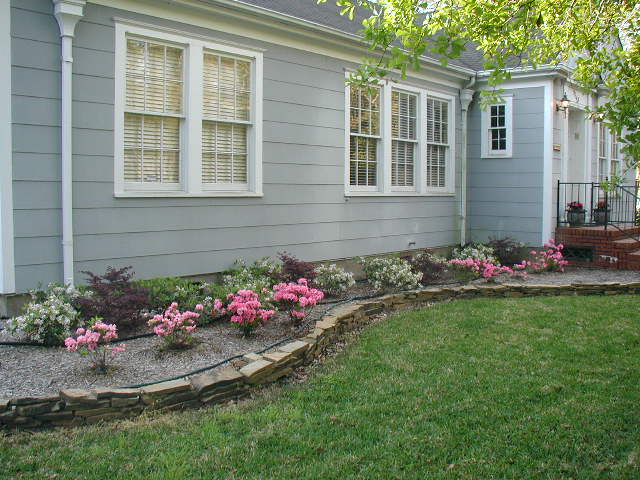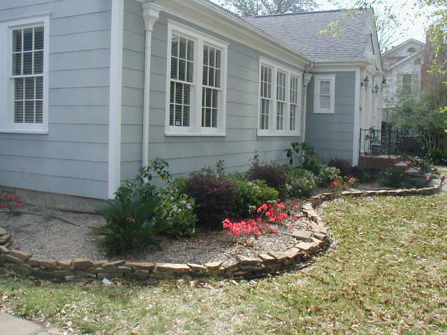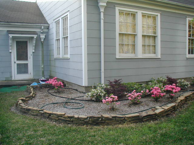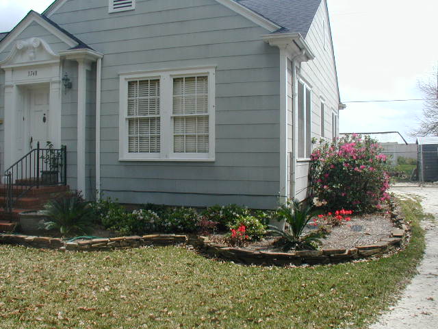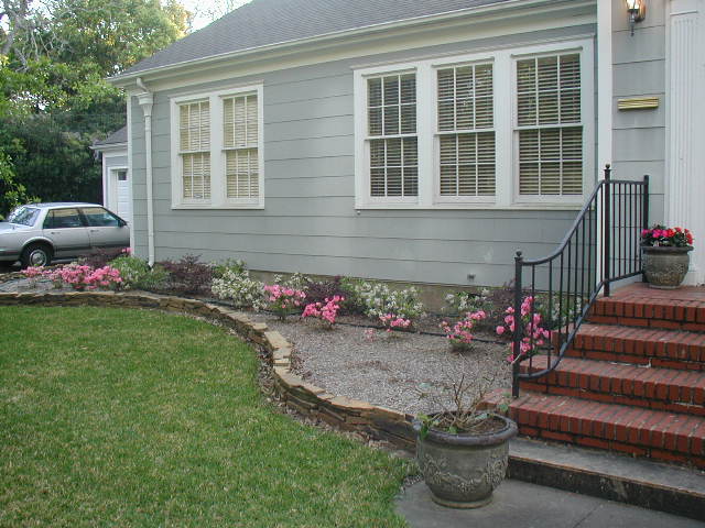 Here are some before and after pictures of the house. Above: how it appeared when I bought it. Below: after putting in the new landscaping. I have since changed the pink azaleas to Red Ruffles because they are much more hardy. The pink ones were sickly during the hot summer months. I have added an irrigation system. This really conserves water by watering each individual plant instead of the entire surface area of the beds like sprinklers and soaker hoses do. I have also added beautiful hybrid hibiscus and sago palms to the landscaping. I'll post updated pictures when they bloom this spring.