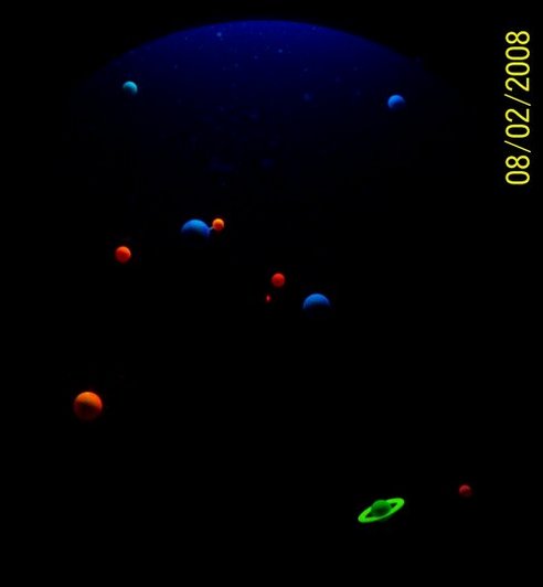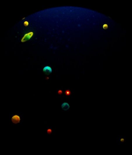 Next is a picture of the flourescent effect in a darkened room. This is really stunning in person. The red light in the center represents the Sun.