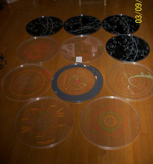 Below is the data plate, showing serial number 515, and eleven of the overlay disks. These are about 16" in diameter. I have a few more: three blanks ones, and two that are supposed to be motorized, but they are missing parts. I also have two duplicate constellation disks: February and April. There are supposed to be 12 of these - one for each month. I only have January through April. If anyone wants to trade for my two spares, please contact me.
