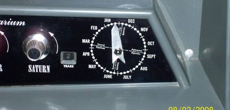 Below is a close up of the control panel. To the right of the Saturn knob is a window with a number - this is the elapsed time, in earth years. When the motor is turned on, the planets begin to orbit. Every time the Earth makes one revolution, the number advances one year. The indicator at the right shows the months, vernal equinox, autumnal equinox, summer solstice, and the winter solstice. The needle was missing but I had a new one made out of stainless steel. It is very similar to the original, I had a photo another owner sent to me to use as a guide. The photo was from an angle, so the dimensions of my new one might not be exactly correct. In the photo below, the needle didn't show up very well. It is flat and the edges are smooth, despite the appearance in the picture.