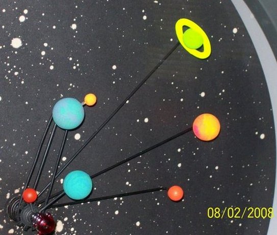 The planets are driven by a motor and ball-chain/pulley system. The ball-chains look like the chains used to secure pens at the bank and other places. The chain that drives Mercury is loose, there is no adjustment so I'm going to have to make a tension bar to take up the slack - Mercury is not rotating properly with the loose chain. Next pictures are close-ups of the planets. The flourescent paint was peeling and you can see two little cracks in the center of the 1/16" thick plexiglass cover by the "Sun" light. There was another large 3" crack at the lower left side of the cover - not seen in this photo. I ordered several sets of flourescent paints, but they were all exactly the same, and the newer paints are different than the old original paints. For instance, the yellow has a greenish tint that the original didn't have. I took a few liberties by slightly modifying the colors of the planets when I repainted them. Note: despite its appearance in the photo on the right, Jupitar does not have a purple spot on it. It is a photo artifact.