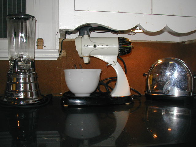 Above: From left, 1955 Waring Blendor, 1957 Sunbeam Mixmaster (I have several attachments for this: juicer, meat grinder, and food slicer/shredder), and 1930's Sunbeam T-9 toaster.