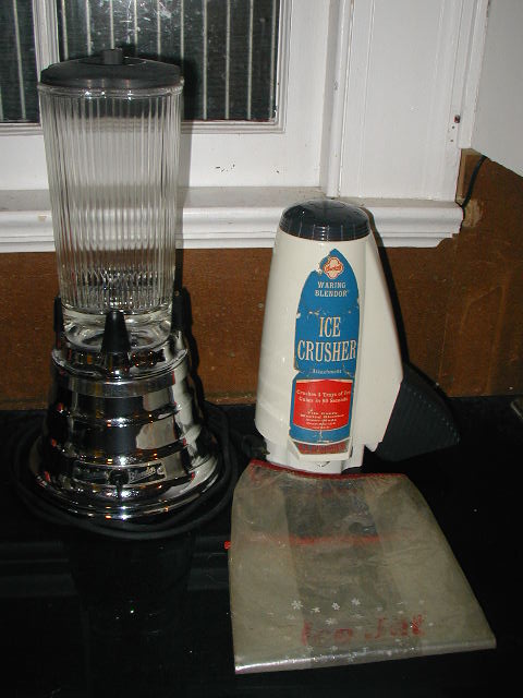 Above is another picture of the 1955 Waring Blendor with rare ice crusher attachment and ice bag. The label claims that it can crush 4 trays of ice in 90 seconds.