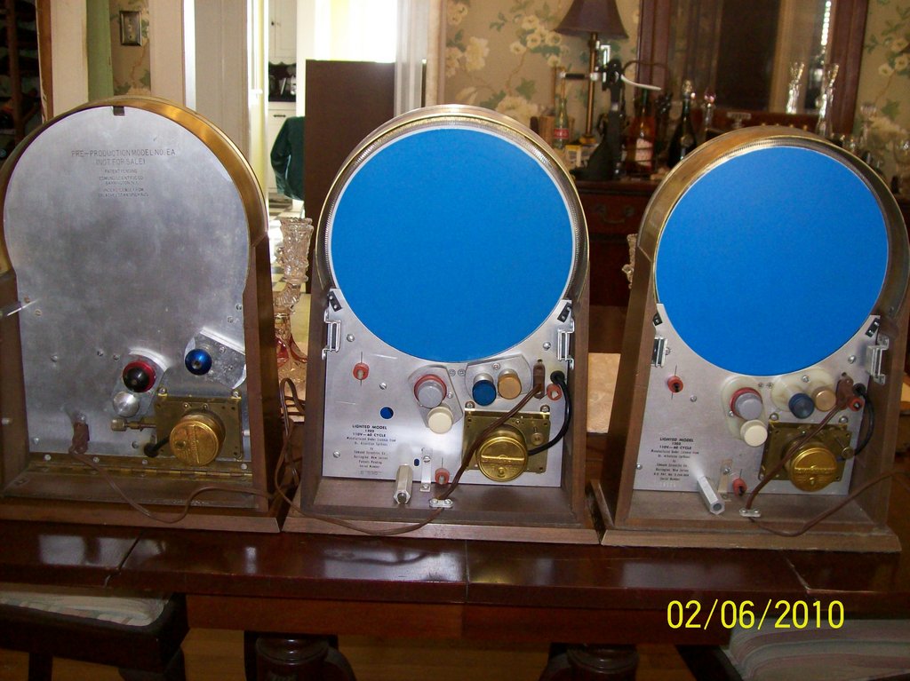 The picture below shows three of my clocks side by side. From the left: prototype, early production (ser. # B690), and late production (ser. # B 2559). The unlighted model is the same as the B690 clock, except the printed text data is in a different location and the electrical connection is horizontal instead of vertical. The adjustment shaft housings are at different angles on the prototype clock and the aluminum back goes all the way to the top. Also, the housings were made out of nylon instead of aluminum on the later production clocks. The clock motor is different on the prototype - the adjustment knob comes out of the left of the motor housing. On the production clocks it is to the upper right of the motor housing and comes out perpendicular to the back of the aluminum back. The plug of the prototype is also in a different location.
