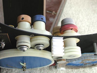 In owning several of these clocks with a wide serial number range, I have noticed a few changes that were made over the years of their production. Several of these differences, notably with the large space disks, are noted on the prototype and unlighted clock pages. At approximately serial number 1000 or so, the aluminum gears were replaced by nylon gears. Also, the clock hands were changed, the sunrise/sunset oval on the star disk was changed, and a couple of holes in the metal chassis were deleted. The earlier clocks have a white guide for the large disks that inserts at the top, it looks like the white guides in the pictures of the gears below. This guide is not fixed in place. The clocks that have it also have a thin piece of plastic glued to the inside top of the brass arch, presumably to act as a stop for this guide so that the motion of the disks doesn't carry it to the side. Some of my clocks have the plastic stop but no guide. I assume they were removed sometime in the past.