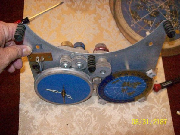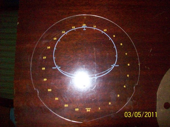 Notice the white plastic guides for the five large space disks used on the prototype and production clock above. The picture below shows a different black round guide that is used, in the same positions as the white guides, on my unlighted model. Note the three curved cut outs on the horizon disk that fit the black guides. This horizon disk is different than the ones on the lighted and prototype models.