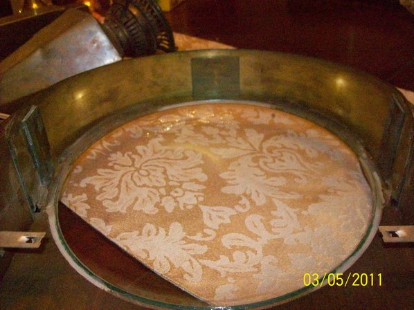 The picture below shows the inside of the arched brass top of the unlighted model. There are three brass pieces glued to the inside of the brass top that help to prevent the disks from being dislodged when the clock is handled. The left side is actually two stacked pieces of brass. The top piece is shorter and only goes about 2/3 of the way to the front. The horizon disk rests where the front edge of this piece is. Removing the disks is difficult since the horizon disk catches on this piece of brass, it is a really tight fit.