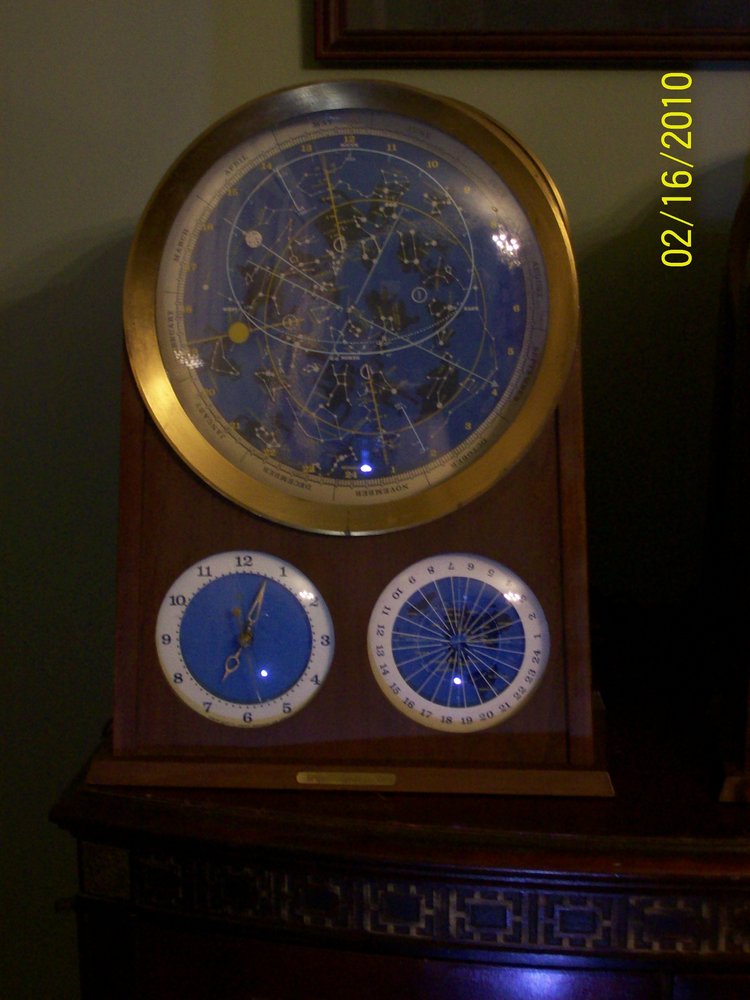 This clock came up for sale on ebay. The seller said that he bought it at a flea market in New Jersey with a lot of other scientific items. The clock was missing the star disk and the sun disk. As chance would have it, another prototype came up for sale on ebay a week after I bought the first one. The second had only the wood and brass clock housing and three disks, including the two missing ones I needed. The seller said that the person he bought it from literally had LOADS of Edmund stuff that seemed like it belonged to an employee or came from a storage facility. I bought the second clock and now I have a complete working prototype.The back panel reads "Pre- Production Model No. EA (Not For Sale) Patent Pending Edmund Scientific Co. Barrington, N.J. Under License From Dr. Athelstan Spilhaus". There are several differences between this clock and the production models, which will be discussed below.