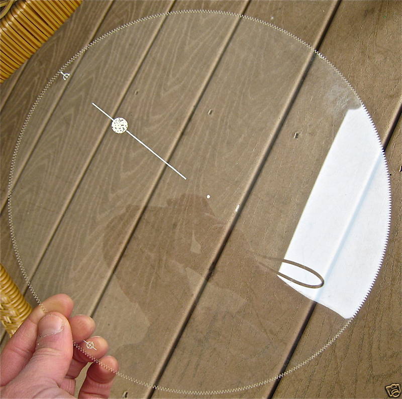 The third disk is the moondisk. The moon image has craters and is painted onto the disk. Production models used a diffraction grating. The pointer line is lighter than on production clocks.