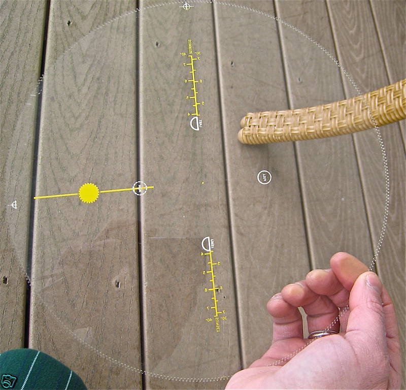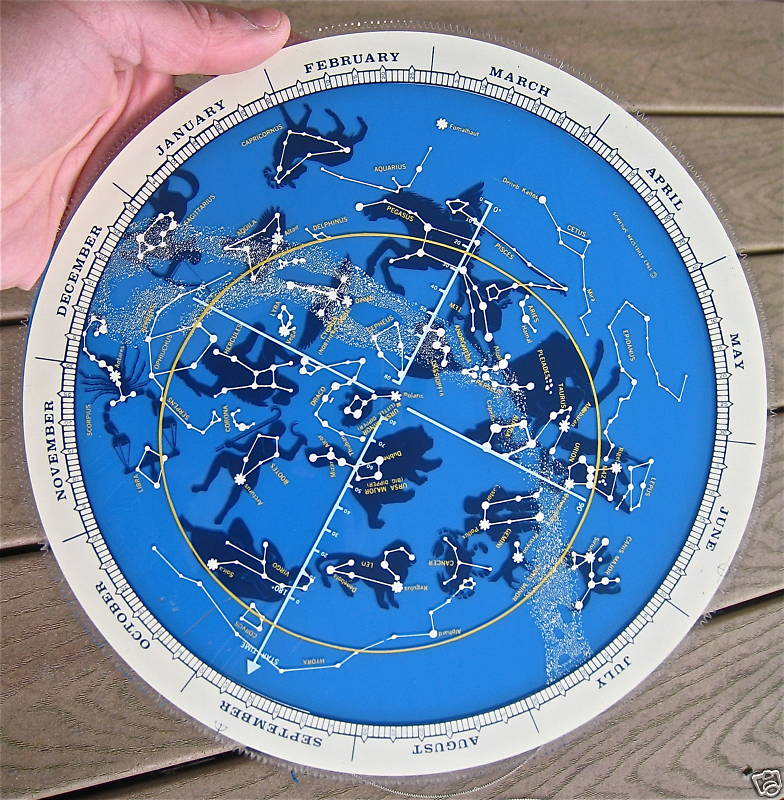 The fifth and final disk is the star and calendar disk. The main difference is the axis lines are positioned a few degrees differently than production models. Note that one axis line ends in an arrow that points to sidereal time. Production models have a separate arrow since the axis angle was moved slightly.