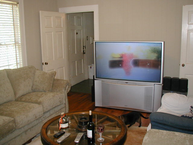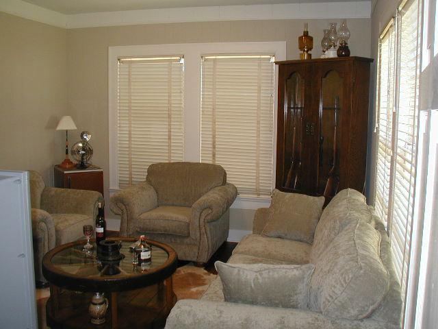 I set up the front bedroom as my TV room. I'm going to have a pedestal style entertainment center made: the electronics will go in it and the TV will sit on top. I made the gun cabinet and coffee table. The blue recliner is going to be sold, there will be more room when it is gone. I ordered my furniture from Hadley's Furniture in Beaumont. I also ordered my bedroom furniture from there.